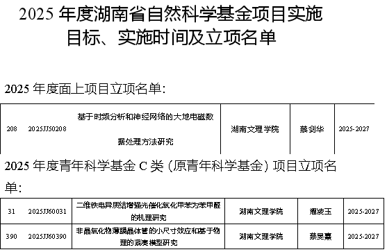 近日,我院3位教师在2025年度湖南省自然科学基金项目评审中获得立项资助。蔡剑华教授获得面上项目资助、蔡旻熹副教授和潘凌玉博士获得青年基金资助。
